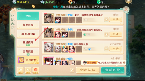 3、在左侧分类中找到【钟馗抓鬼】,点击进入该活动的组队列表。