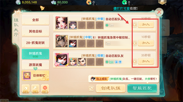 4、选择合适的队伍,点击【加入】,即可参与钟馗抓鬼活动,通过组队完成任务获取经验和奖励。