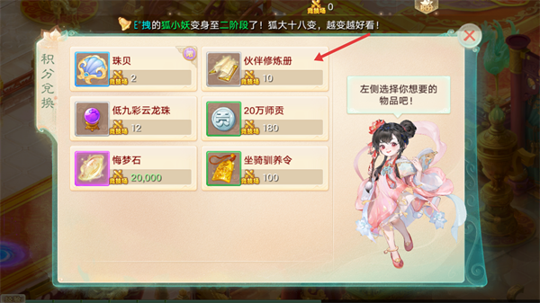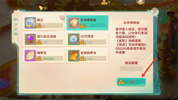 4、消耗10点竞技场积分兑换【伙伴修炼册】,获取后可用于提升伙伴战力。