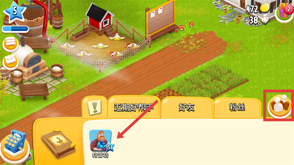 1、点击右侧好友按钮,找到【格雷格】,进入其农场可参与互动,获取资源或完成合作任务。