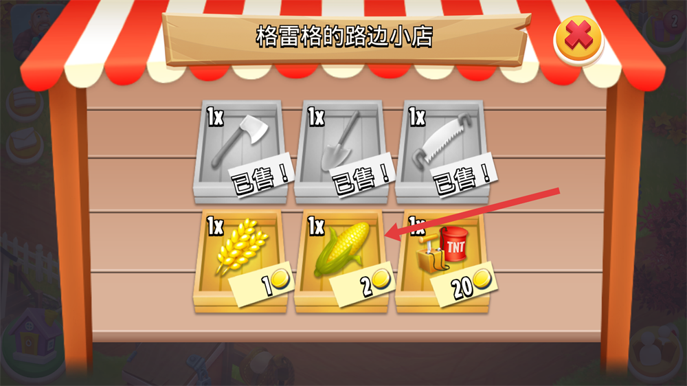 3、在【格雷格的路边小店】中,可花费金币购买所需物资,如【玉米-2金币】,及时补充农场生产资源。