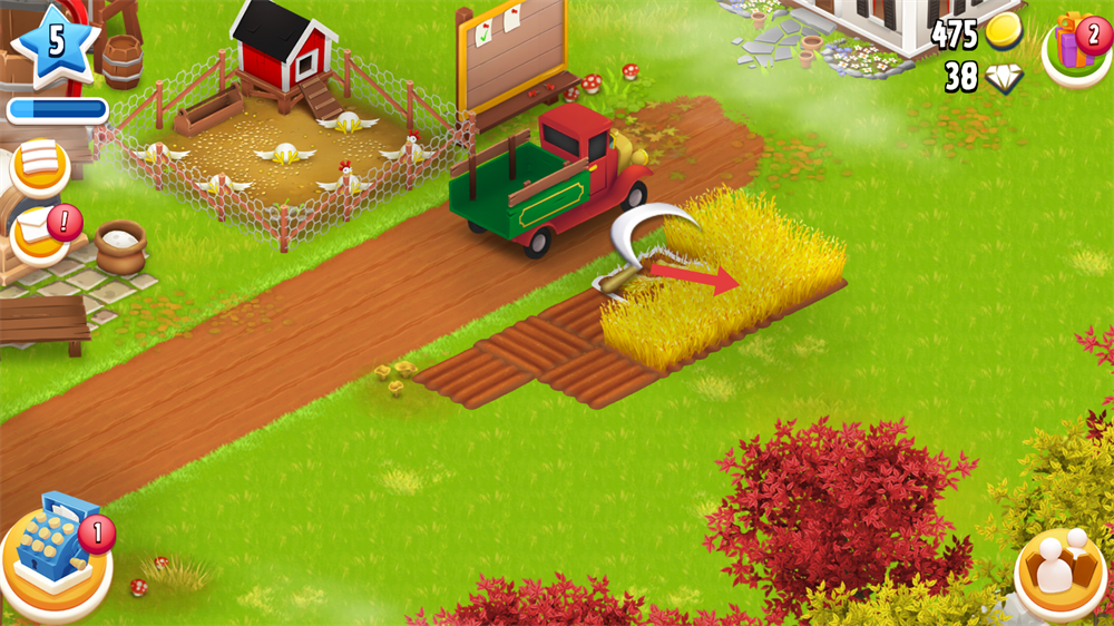4、使用镰刀收割成熟的【小麦】,收获后可用于生产加工或在小店出售,获取金币提升农场收益。