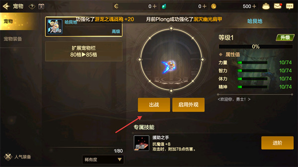 3、选择宠物后,点击【出战】,让宠物跟随角色参与战斗,辅助角色作战。