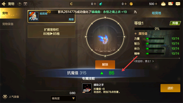 4、宠物出战后,可提升角色的抗魔值等属性,增强角色战力。