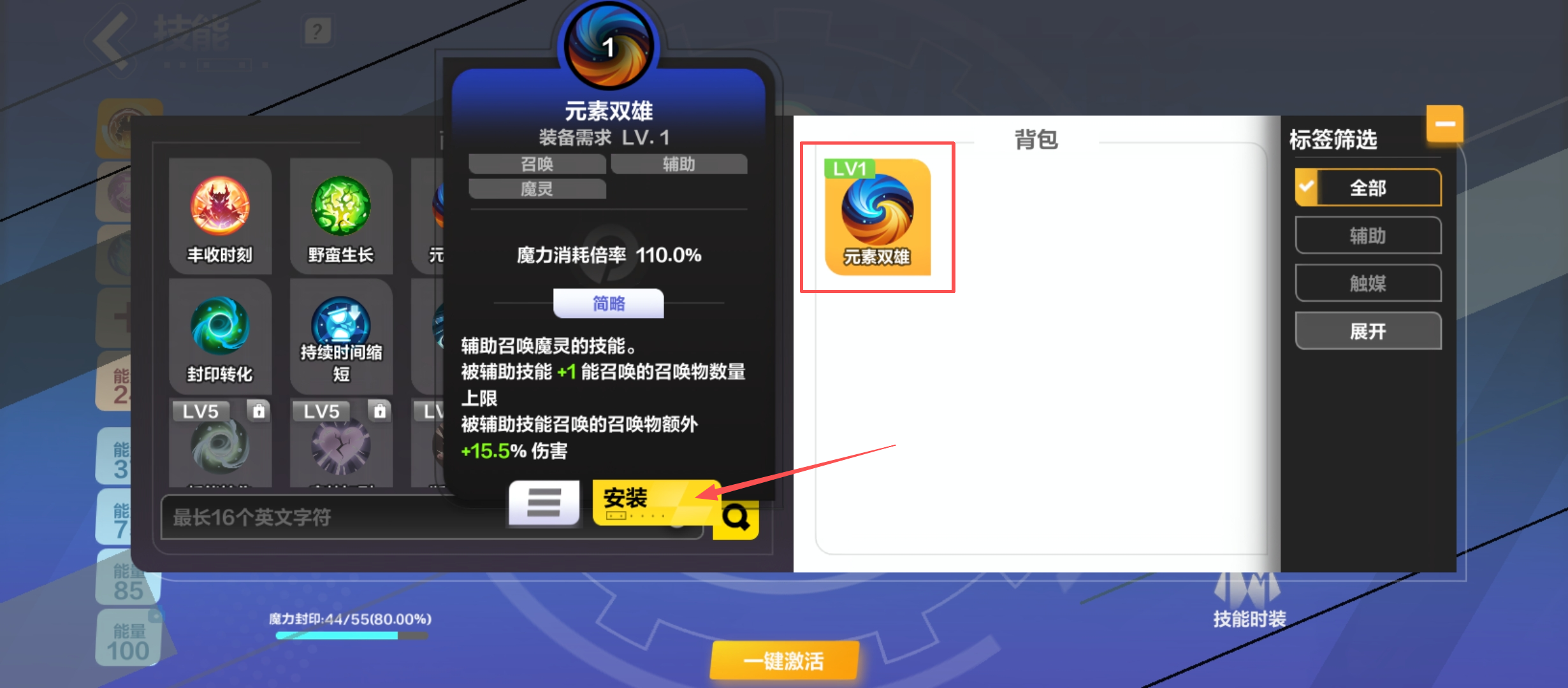 3、在背包找到【元素双雄】技能,点击安装,它能提升召唤物伤害和数量,助力战斗,赶紧装上强化战力吧。