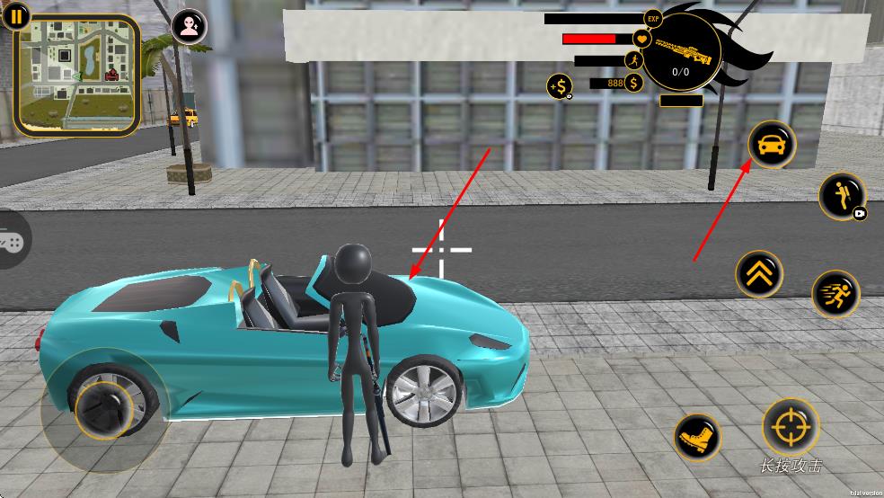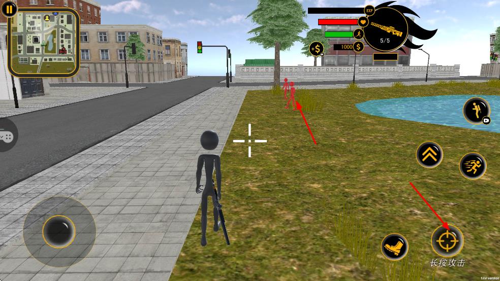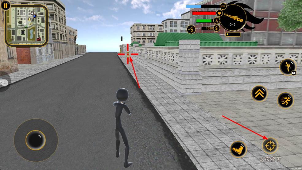 3、继续寻找红色敌人,再次点击“长按攻击”按钮,消灭敌人。