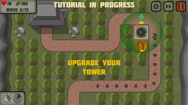 1、花费金币升级防御塔,提升其攻击力和攻击范围,增强对敌人的打击能力。