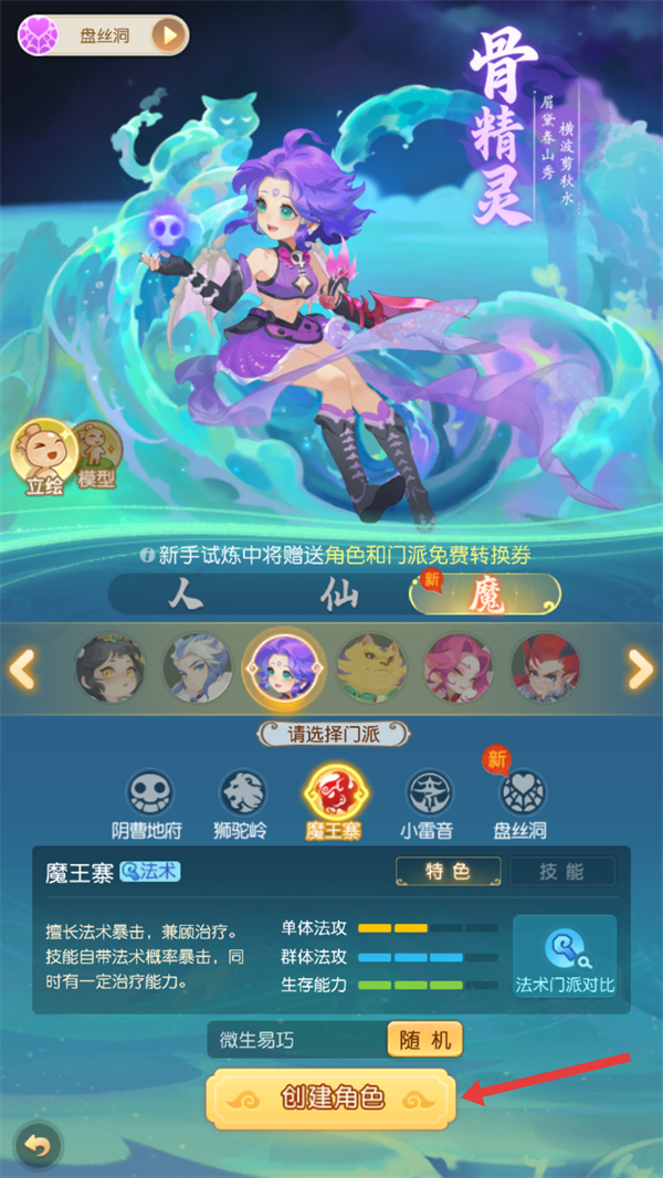 1、选择骨精灵角色,加入魔王寨门派后,点击【创建角色】,踏入西游冒险之旅。