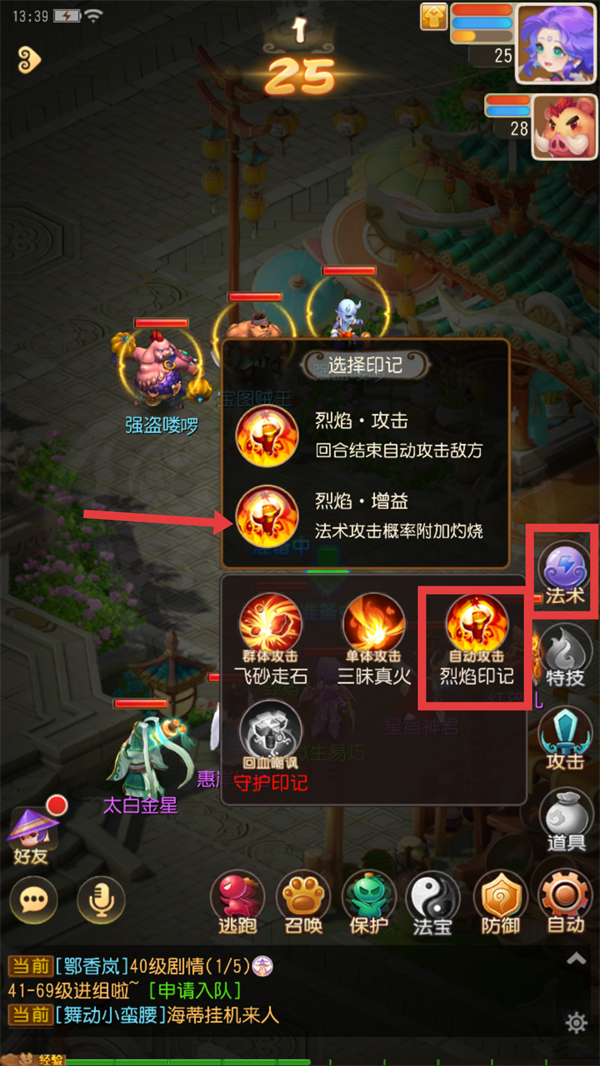 2、战斗时点击【法术】,选择【烈焰印记】,再选【烈焰-增益】,使法术攻击概率附加灼烧效果。