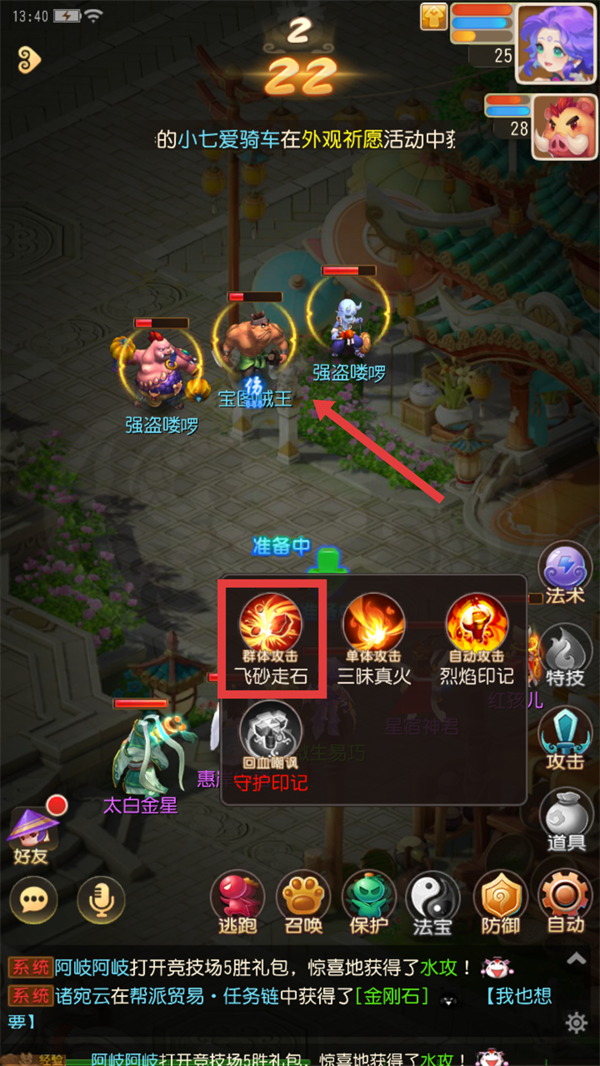 4、下一回合选择【群体攻击-飞砂走石】,配合烈焰增益效果,对多个敌人打出高额伤害。