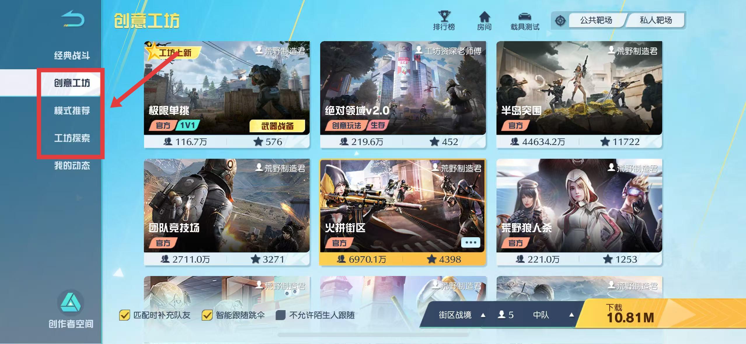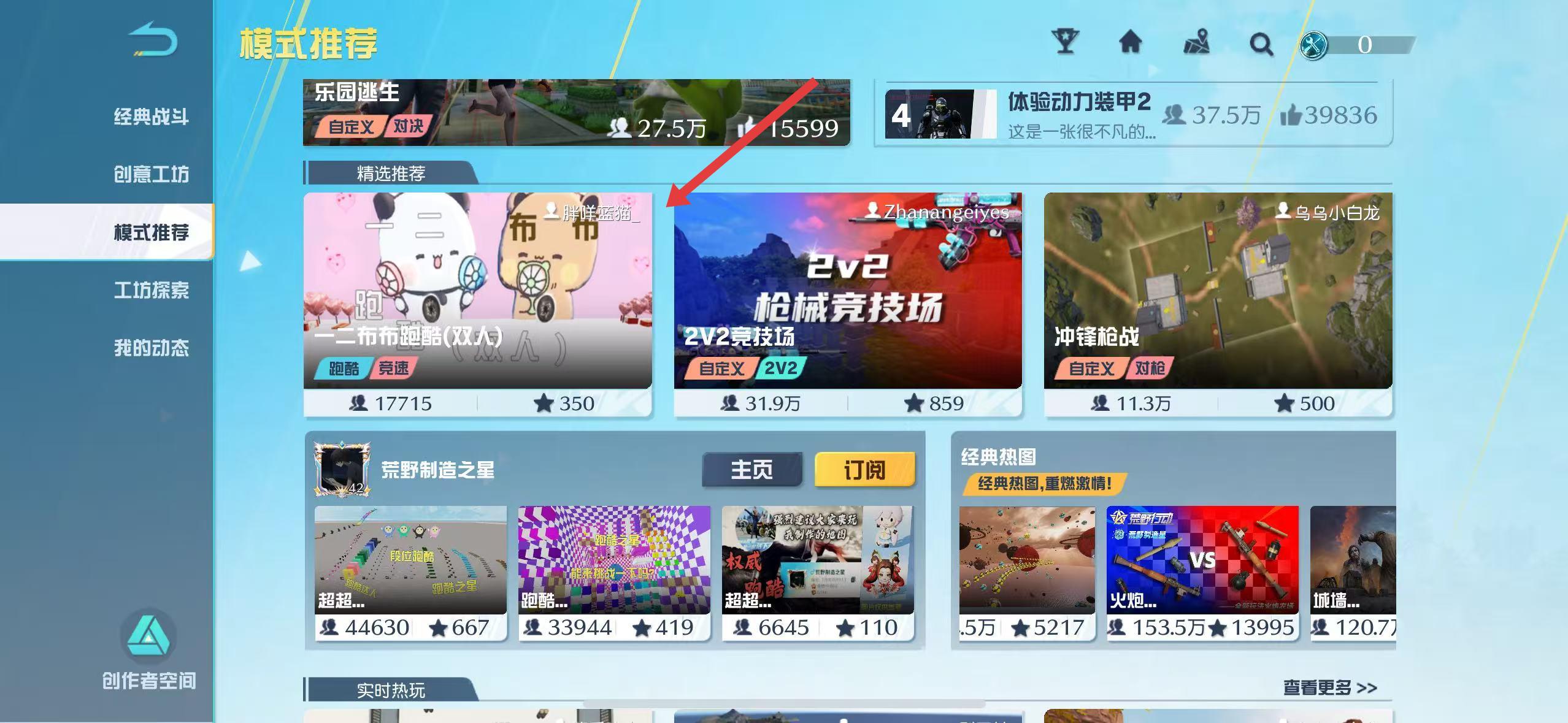 2、在创意工坊中,选择【模式推荐】【工坊探索】等分类。