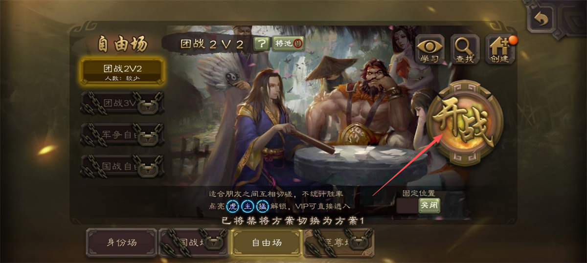 1、玩【自由场】时,点击【开战】快速进入对局,不统计胜率轻松对战哦。