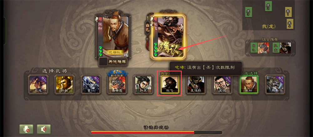 2、选将阶段,优先选像【张飞】这样技能强力的武将,选好后赶紧点击【确认】啦。