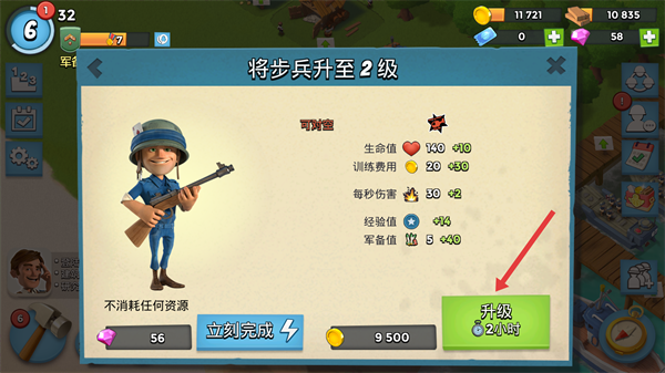 3、在升级界面,点击【升级】按钮,启动步兵升级。