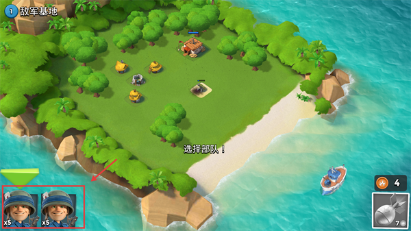《海岛奇兵》从沙滩指定范围内登陆。然后在海面上有战舰提供导弹、医疗支援,同时还能释放引导弹进行实时打击目标指挥。至于坐着登陆艇成功冲上岸的士兵,全自动战斗,会优先攻击最近的建筑,这时就需要你引导他们集中火力,打掉敌方防御工事先。最后,只要摧毁敌人的司令部就能引爆敌人整个基地,获得胜利,拿到战利品。