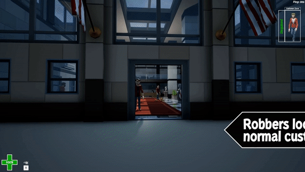 在这个游戏中,一个劫匪团队试图从银行偷钱和其他物品,同时尽量不被警察团队注意到。警察在对抗上有很大的优势,所以对于劫匪来说,保持低调、融入人群是至关重要的。等待一个完美的时刻来击倒一名员工,并在潜行、钻探、轰炸或侵入战利品时使用他的衣服作为伪装!