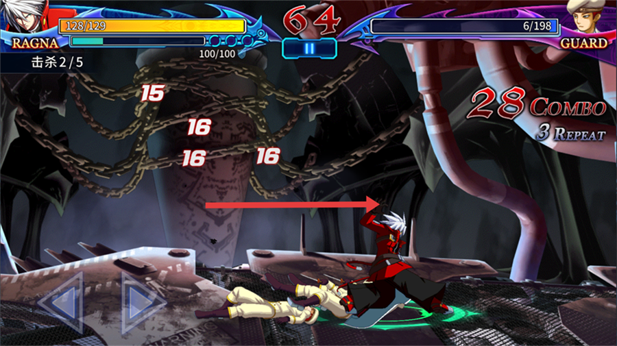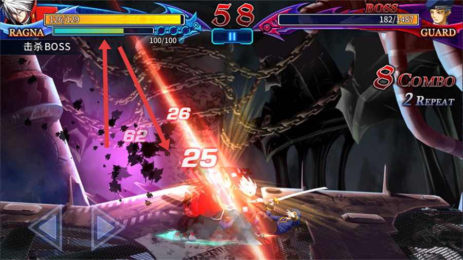 2、左右滑动右侧屏幕,能打出左右勾拳,可将连击数提升至【28-COMBO】,快速消耗敌人血量哦。