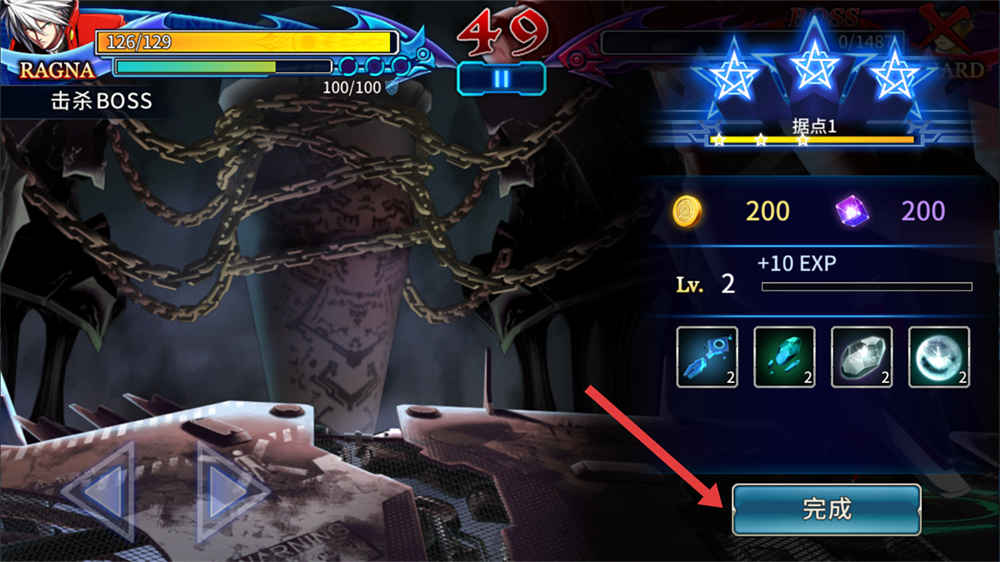 4、通关后,点击【完成】按钮,可领取金币、经验与道具奖励。