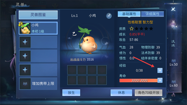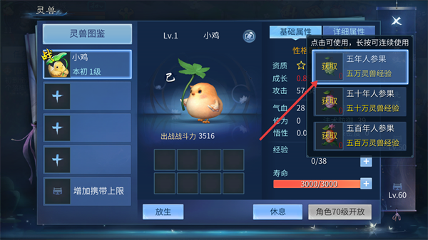4、使用【人参果】等道具,提升灵兽经验,助力灵兽成长。