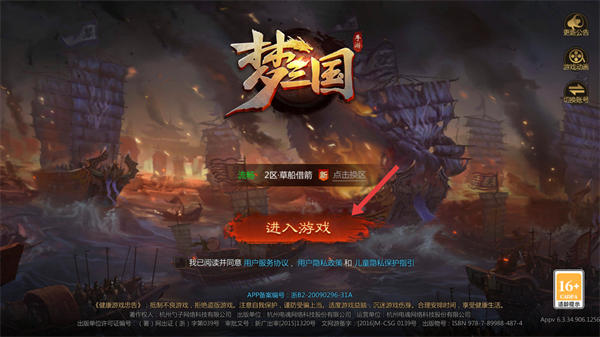 1、进入【梦三国】游戏,先确认选区后点击【进入游戏】。