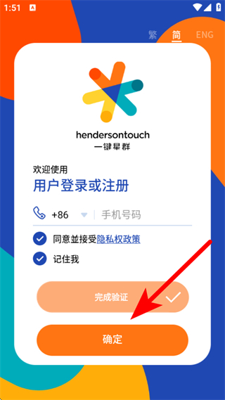 1、打开一键星群APP,输入手机号码,点击完成验证再点击确定。