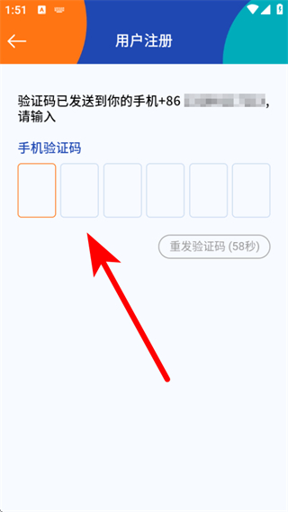 2、在用户注册页面,输入手机收到的验证码,完成验证步骤。