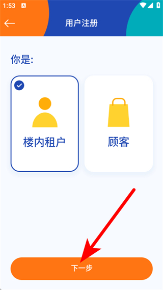 3、选择身份类型如楼内租户,点击下一步,进入信息填写页面。