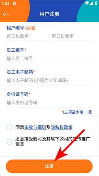 4、在信息填写页面,填写租户编号等信息后点击注册,完成注册。