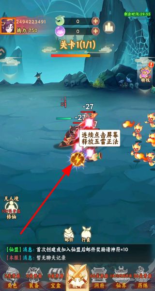2、连续点击屏幕释放五雷正法技能,攻击敌人,提升战斗效率,助力击败妖怪。