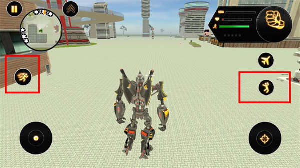 4、还有跑步、跳跃等功能按键,跑步可提升移动速度,快速穿梭城市,跳跃可让机器人翻越障碍,到达高处区域,丰富探索与战斗的操作方式。