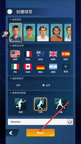 2、在创建球员界面,选择球员、出生地、惯用手、球员类型后,点击【Next】按钮,继续游戏流程。