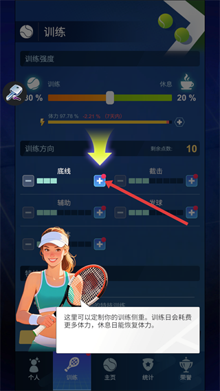 3、进入训练界面,在训练方向的底线选项处点击加号,分配训练点数,定制训练侧重。