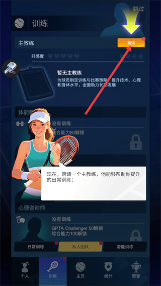 4、在训练的私人团队界面,点击“聘请”按钮,聘请主教练,助力提升日常训练。