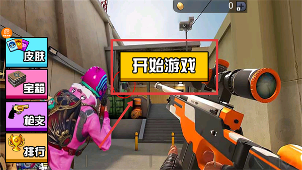 1、进入游戏主界面后,优先点击【开始游戏】按钮进入战斗,同时可利用左侧【皮肤】【宝箱】等功能提升初始战力。