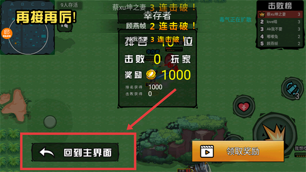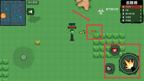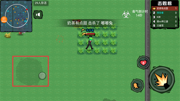 2、战斗中需关注右侧【击败榜】了解排名,利用底部移动按钮灵活走位,同时注意【毒气倒计时】及时转移避免掉血。