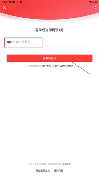 2、进入登录的页面内,输入手机号并点击获取验证码。