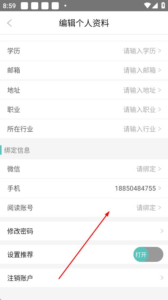 3、进入设置相关界面后,下滑找到绑定信息板块,点击阅读账号选项。