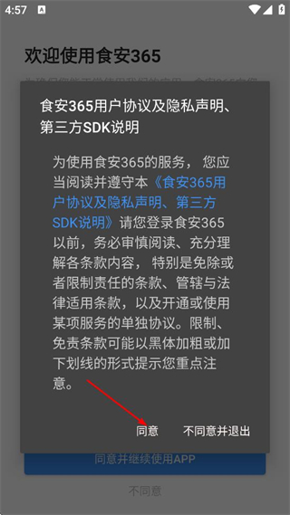 1、在食安365的用户协议及隐私声明弹窗中,阅读相关条款后,点击同意。