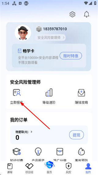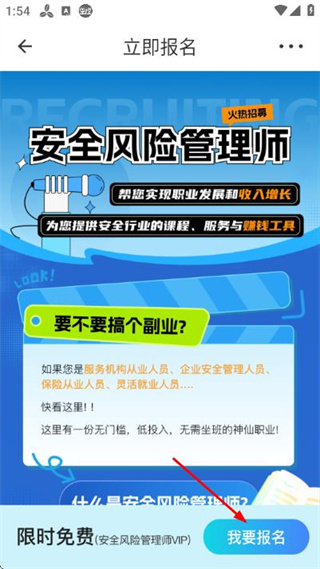 2、在我的页面点击立即报名,进入安全风险管理师的立即报名页面。