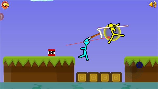 2、利用武器攻击对手,可借助场景元素如TNT辅助压制,消耗对方血量。