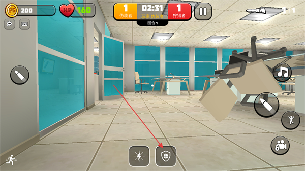 1、猎人身份时,在房间内移动,搜寻伪装者,目标锁定桌椅区域。