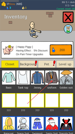 4、更换服装后,乞丐外观变化,同时提升收益效率,继续积累金币推进游戏。
