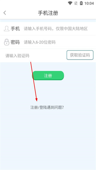 2、进入手机注册页面,点击注册/登陆遇到问题选项。