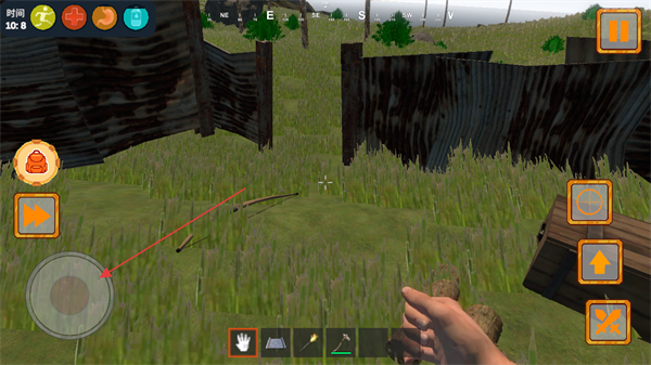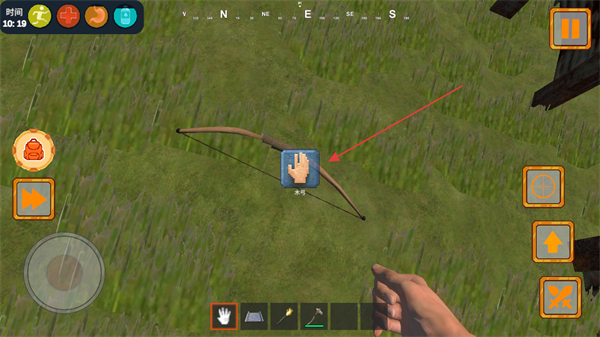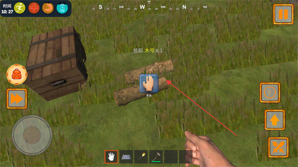 2、点击道具上的拾取按钮,获取木弓、木头等生存物资。