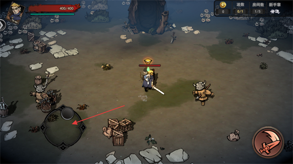 1、操控角色移动,靠近场景中的敌人如持剑怪、牛角怪触发战斗。