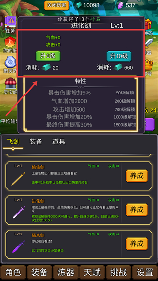 1、建议优先升级【进化剑】,消耗【砖石】选择【升1级】或【升10级】,解锁特性提升暴击伤害与气血攻击。