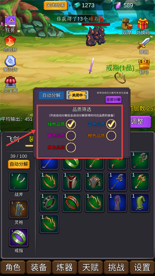 3、开启自动分解时勾选【绿色品质】和【蓝色品质】,保留【紫色品质】和【橙色品质】装备,避免资源浪费。