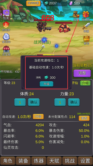 4、消耗【砖石】300升级攻速档位,提升基础自动攻速至10次/秒以上,增加攻击频率提升输出。