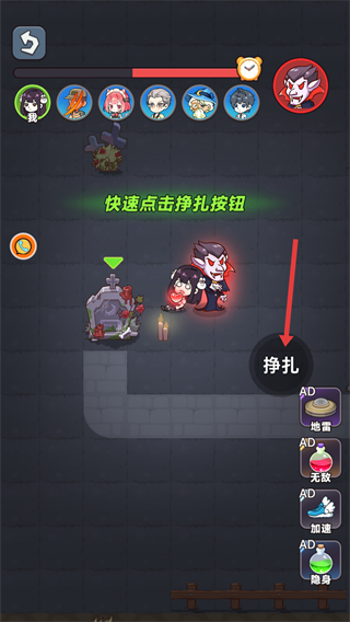 3、被猛鬼抓捕后,按照提示快速点击【挣扎】按钮,尝试摆脱猛鬼的控制,继续推进游戏。