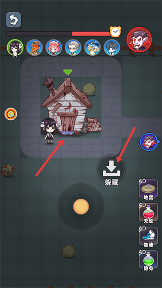 4、操控角色移动至小屋附近的区域,点击界面中的【躲藏】按钮,借助建筑躲避猛鬼的追击。